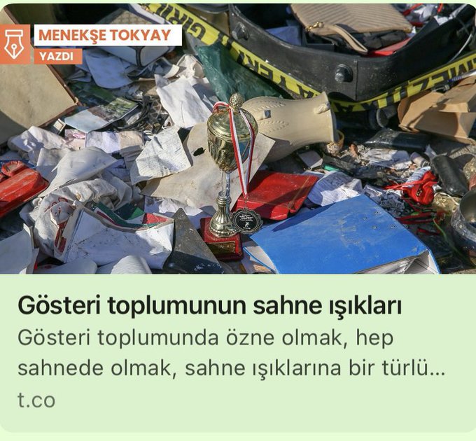 Gösteri toplumunda enkazın ortasındaki son kitabına odaklanan sahne ışıkları, bu görüntüyü sosyal medya hesaplarında paylaşan yazarı esrik bir gurura sürükler – o enkazın altında yok olan onca hayatın içindeki öyküler ise bu ışıklardan nasibini alamaz. Oysa o kitaplar artık yazarın değil enkazın ürünüdür.